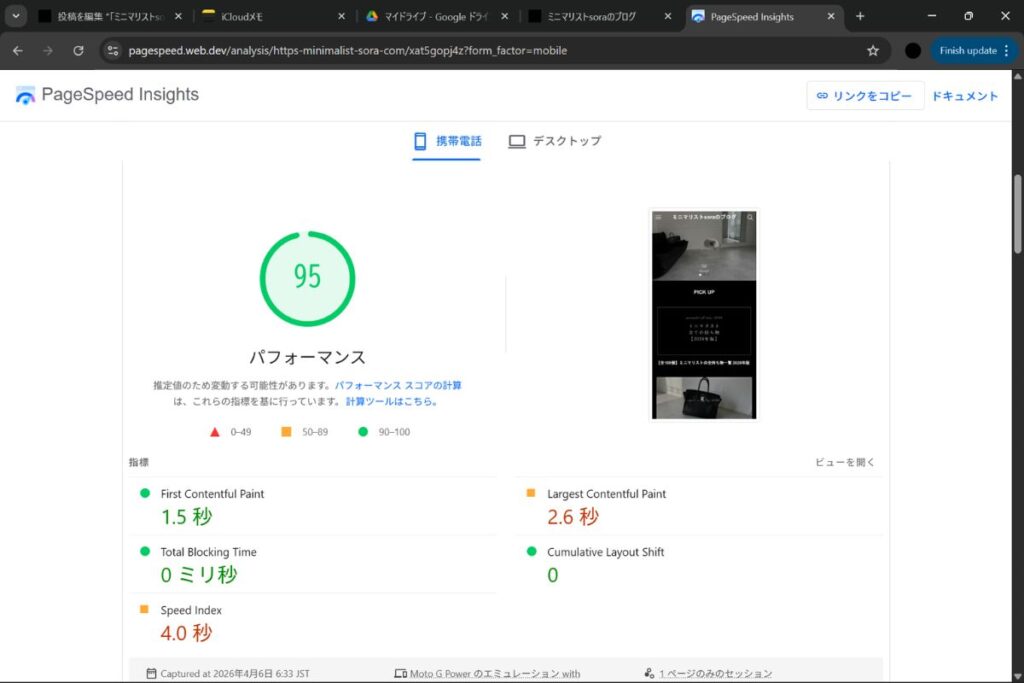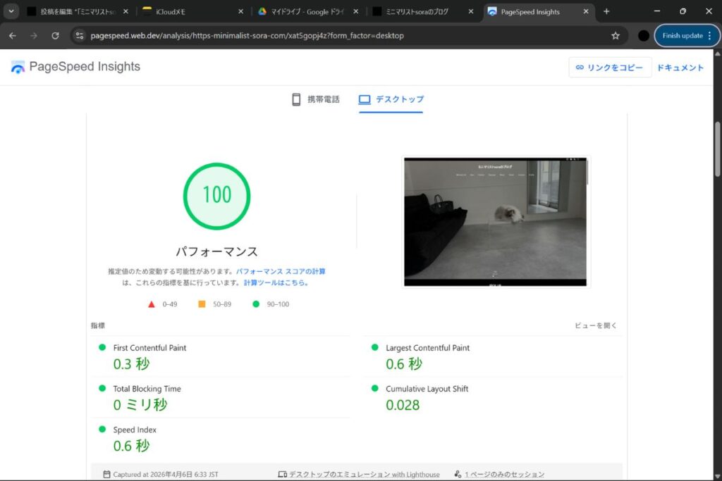 PageSpeed Insightsによる評価はモバイル表示で95点、デスクトップ表示で100点とかなりの高得点となっていて、これは密かな自慢だ。