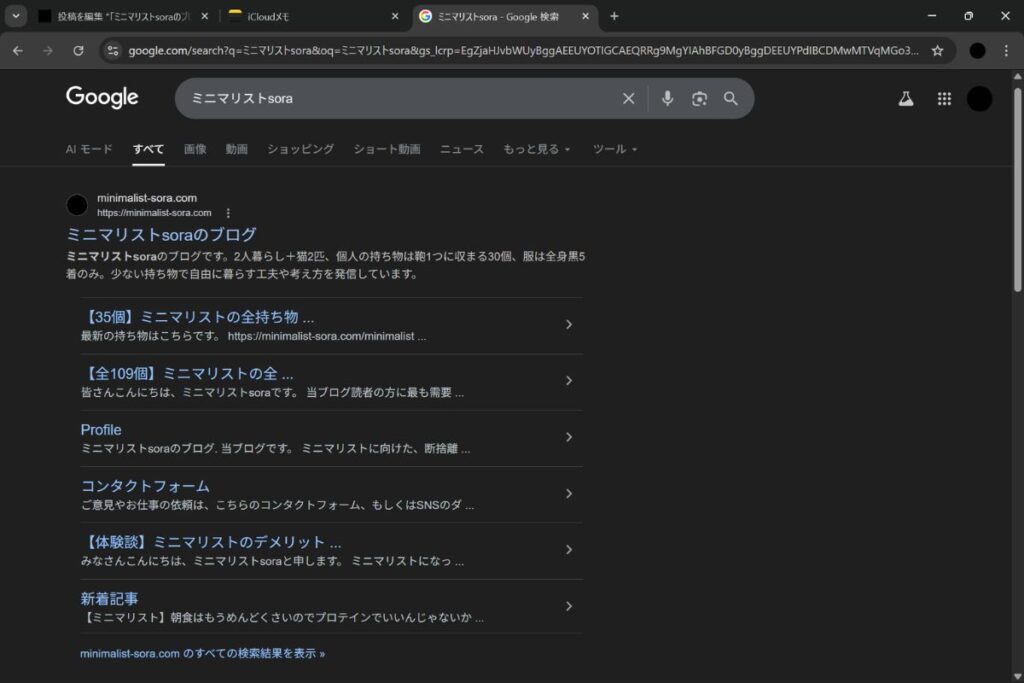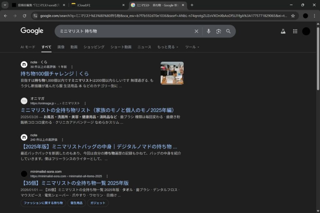 でもありがたいことに、私の全ての持ち物リストの記事が「ミニマリスト 持ち物」という検索結果で常に上位を取っている。なのでこのキーワードからはGoogle検索からの流入が結構ある。