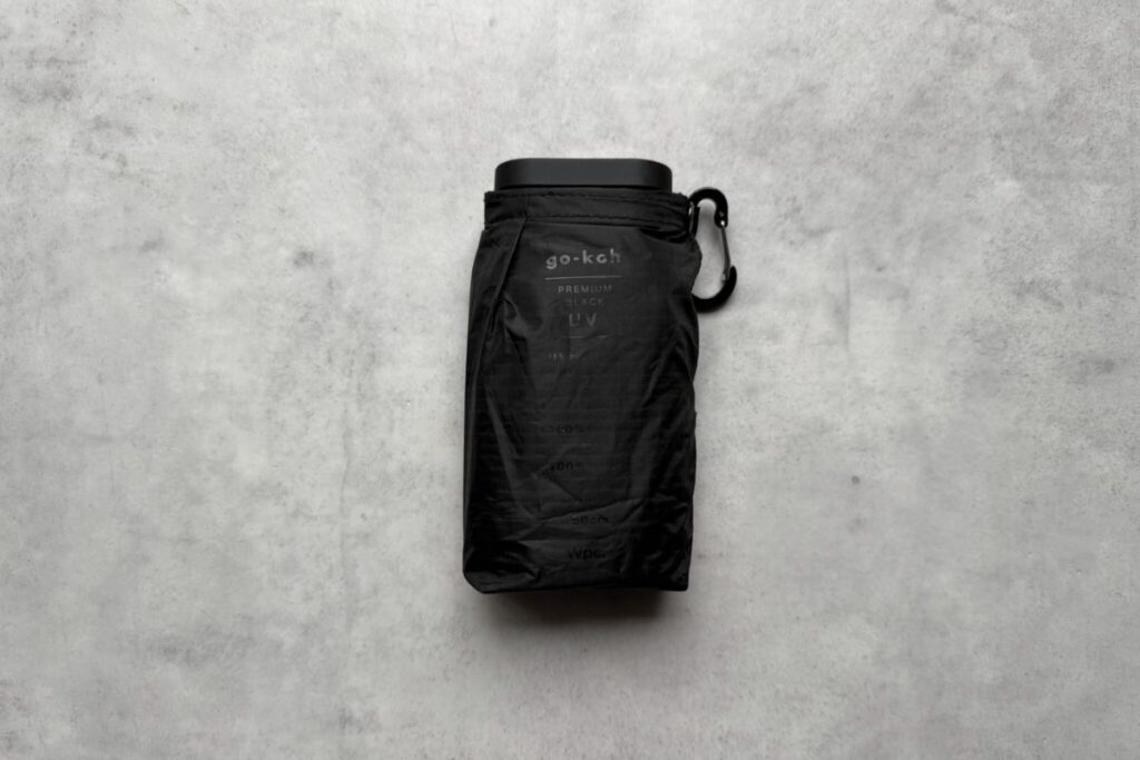 スマートフォンに隠れるほどのサイズ感で、持ち運びが容易である。ズボンのポケットにも余裕で入るので、折り畳み傘を携帯しながらも手ぶらという夢が叶う。