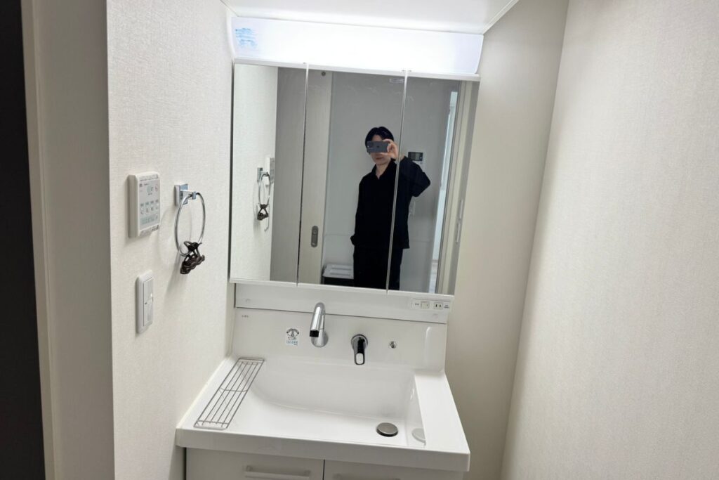 賃貸によくあるタイプの独立洗面台。普通ここにスキンケア用品を収納すると思うが、私のスキンケアはワセリンで完結するので収納は使っていない。