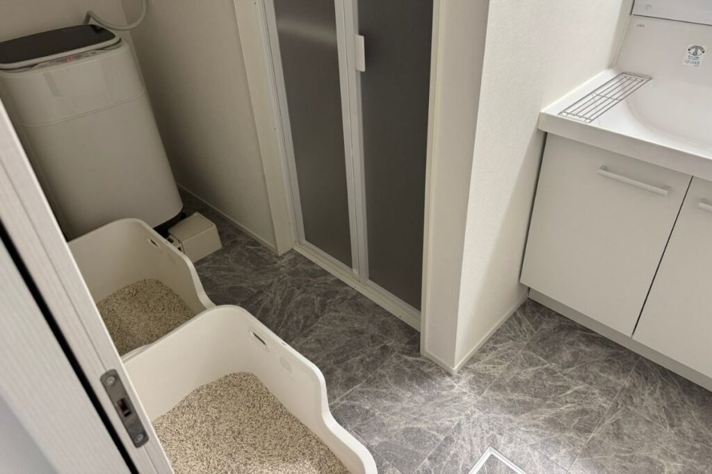こちらは洗面所。洗濯機や猫のトイレを設置している。