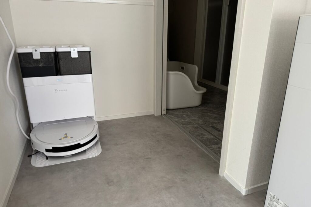 洗面所の入口あたりにロボット掃除機のステーションを設置している。モップまで自動洗浄してくれるタイプで本当にありがたい。