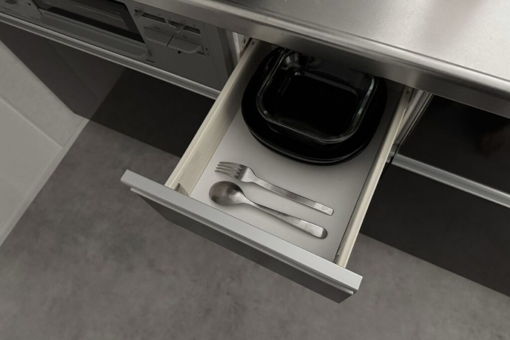 キッチンカウンターの引き出しに、皿とカトラリー系を収納している。この辺は本当に最低限しか持たないようにしている。