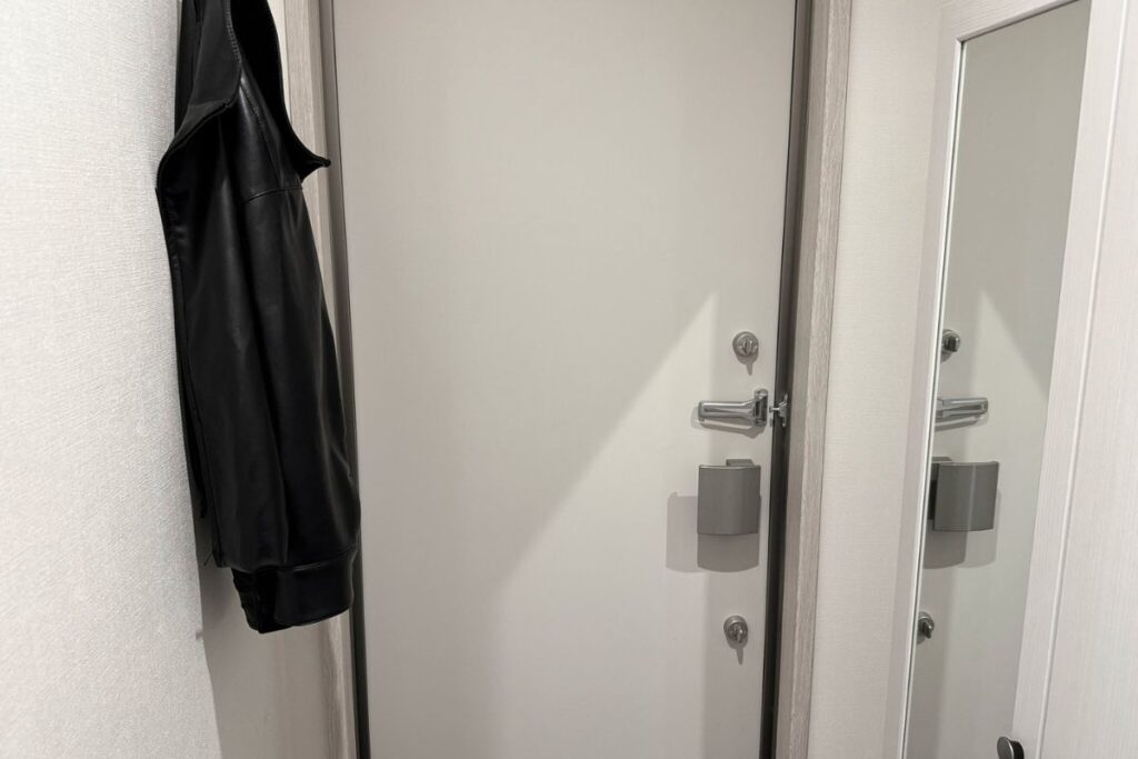 玄関に備え付けられているフックにアウターをかけている。アウターの着脱は玄関で行う。