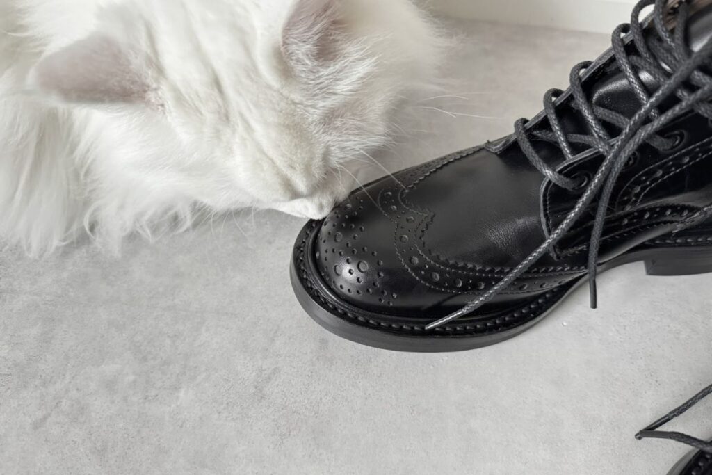 ところで、うちの猫は紐が好きだ。この靴の紐でもめっちゃ遊ぶ。嚙み千切られそうなほど食いつくので、こうやって写真を撮るのも容易ではない作業でなかなか骨が折れる。